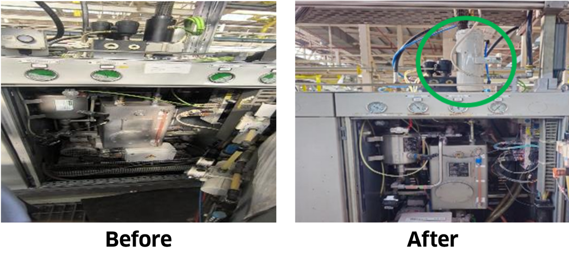 The existing coolant filling machine was originally designed for earlier models with lower filling capacity, which created a fundamental limitation when applied to the new vehicle model. The mismatch in design capacity resulted in excessive back pressure during the coolant filling cycle. This abnormal pressure condition triggered the safety relief valve, causing coolants to be sprayed out of the system. The consequence was spillage within the machine area, contamination of critical components, and increased safety risks for operators. In addition to compromising workplace cleanliness, the issue highlighted a design inadequacy that required corrective action to ensure stable and reliable filling operations.